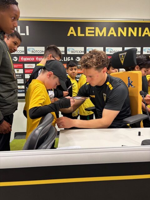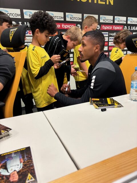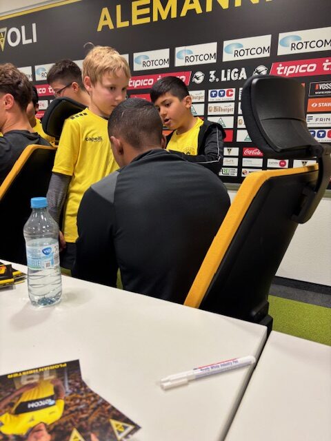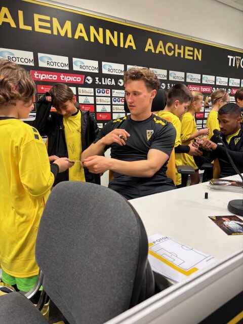 Ein Highlight am zweiten Tag des Camps war die Pressekonferenz mit drei Spielern der 1. Mannschaft. So beantworteten Jan Olschowsky, Florian Heister und Pierre Nadjombe geduldig die zahlreichen Fragen der Kinder und gaben anschließend die heiß begehrten Autogramme.